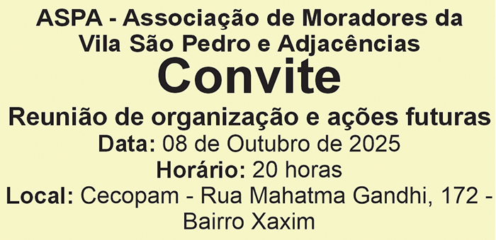 A Associação de Moradores da Vila São Pedro e Adjacências (ASPA) convoca os moradores das Vilas São Pedro, Rex, Independência I e II e Jardim Urano para uma reunião de organização no dia 08 de outubro, visando novas ações de melhoria.