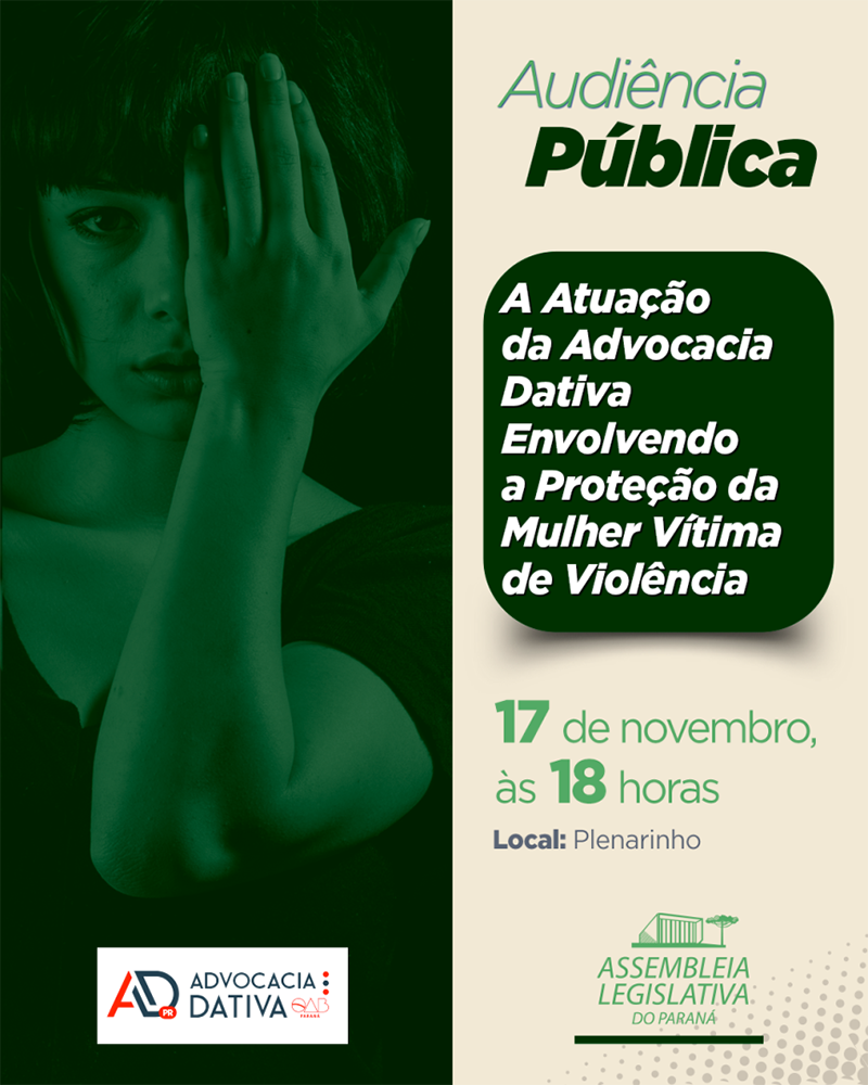 A Assembleia Legislativa do Paraná realiza na próxima segunda (17/11) uma audiência pública para discutir a criação de um Projeto de Lei que assegure advogados gratuitos para mulheres vítimas de violência.