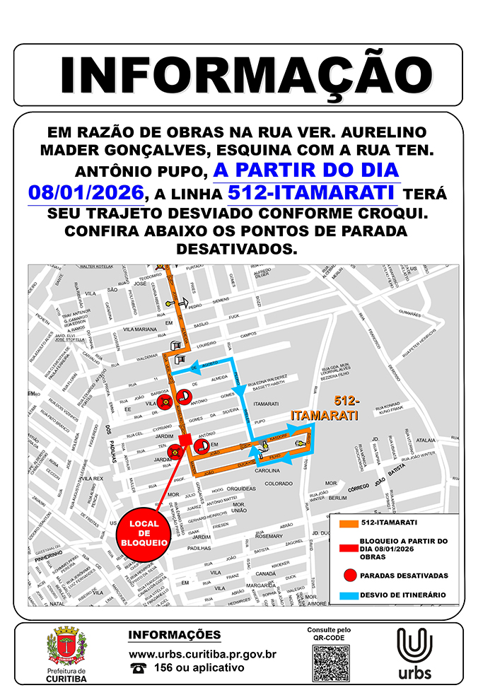 A interdição também impacta o transporte público. Durante o período de obras, a linha 512 – Itamarati está com seu itinerário alterado, passando pelas ruas 11 de Agosto, Pedro Wieler, João Kasdorf, David Tows e João Duck Filho.