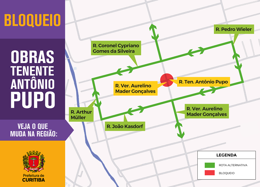 mapa de bloqueio da rua tenente antonio pupo, no Xaxim