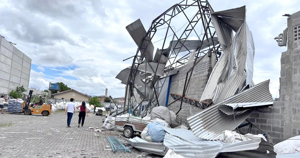 Estrutura metálica de galpão retorcida e destruída após vendaval no Paraná, ilustrando a necessidade de prevenção de desastres e a atuação da Defesa Civil.