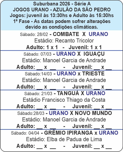 Anexa abaixo tabela com os próximos jogos do Urano.